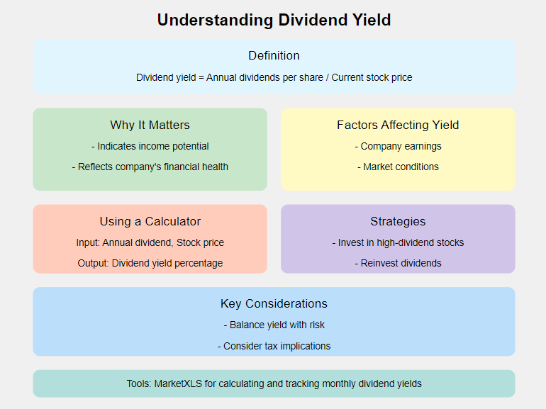 The article explains the importance of dividend yield in stock investments. It details how to calculate it using a dividend yield calculator and offers strategies for optimizing returns.The article discusses factors affecting dividend yield, its role in portfolio management, tax implications, and using yield for monthly income. Additionally, it discusses MarketXLS for calculating and tracking monthly yields efficiently.