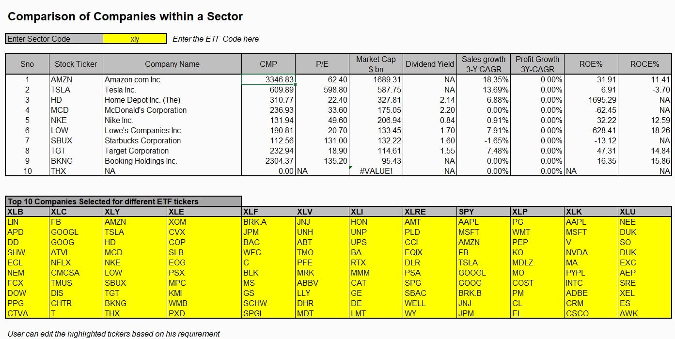 ##** Intra Sector Comparison using MarketXLS Template:**MarketXLS provides a ready-to-use template for facilitating intra sector comparison of companies on the basis of Market Cap. for various sectors. Using the Intra Sector View template, the Investor can select the ETF and compare the companies that are part of that index. The investor can also modify the stocks/components of the ETF based on his requirement. The comparison is based on CMP, Market Capitalisation, P/E, Revenue, and Profit Growth, ROE, and ROC indicators.