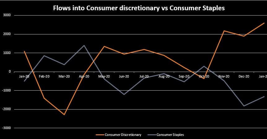 Generally, when the economy is strong, consumers have more income and spend more on consumer discretionary products. On the other hand, when an economy is in contraction, consumers tend to earn less and divert their spending more on consumer staples, also known as consumer defensive.